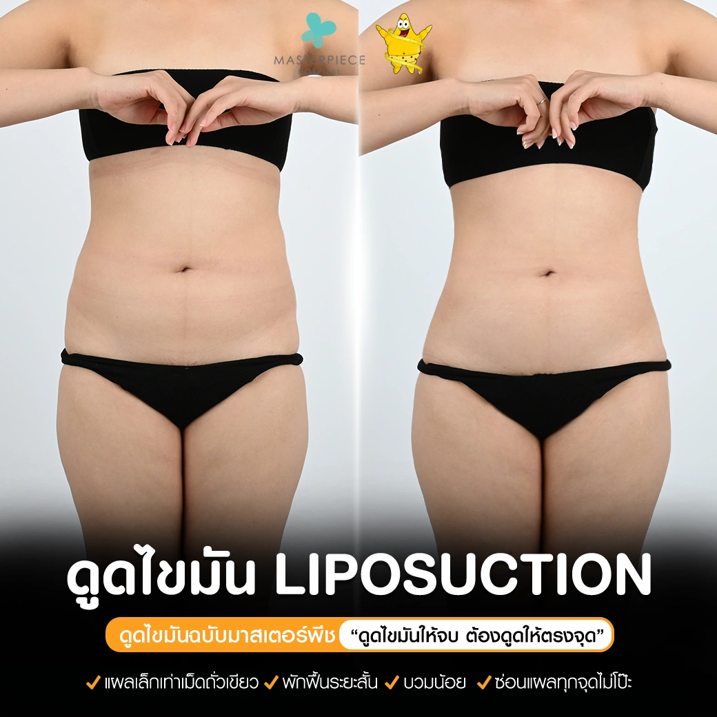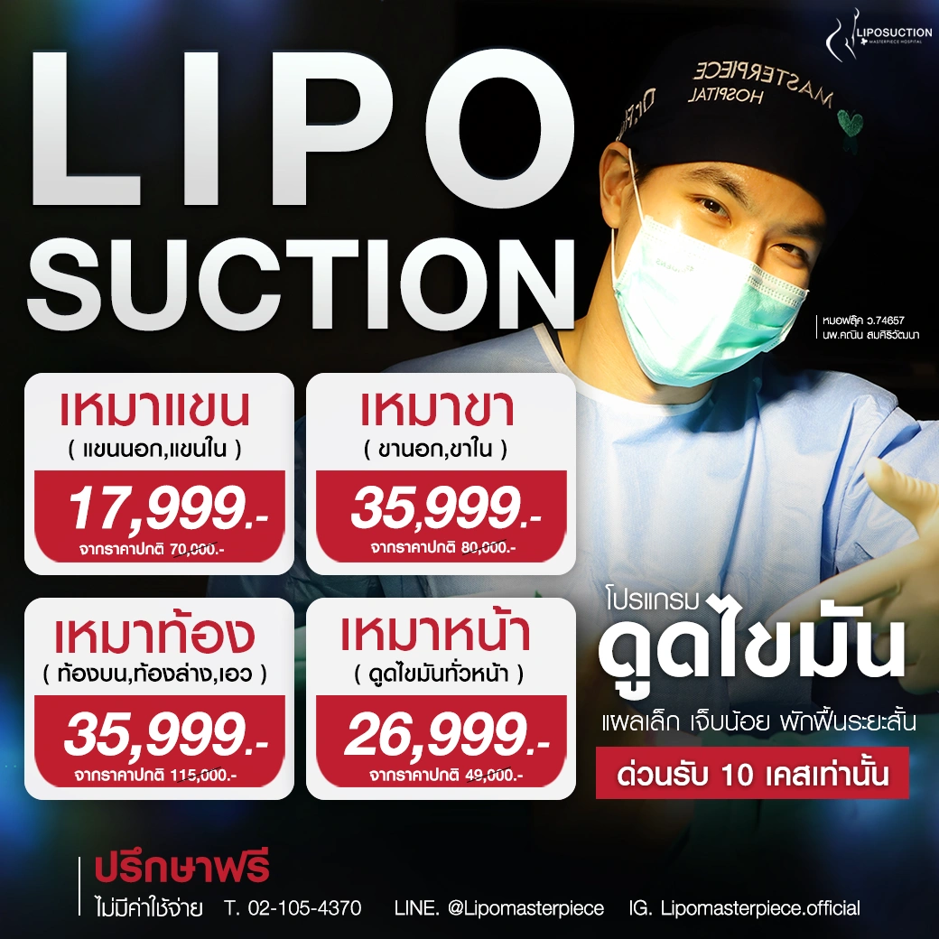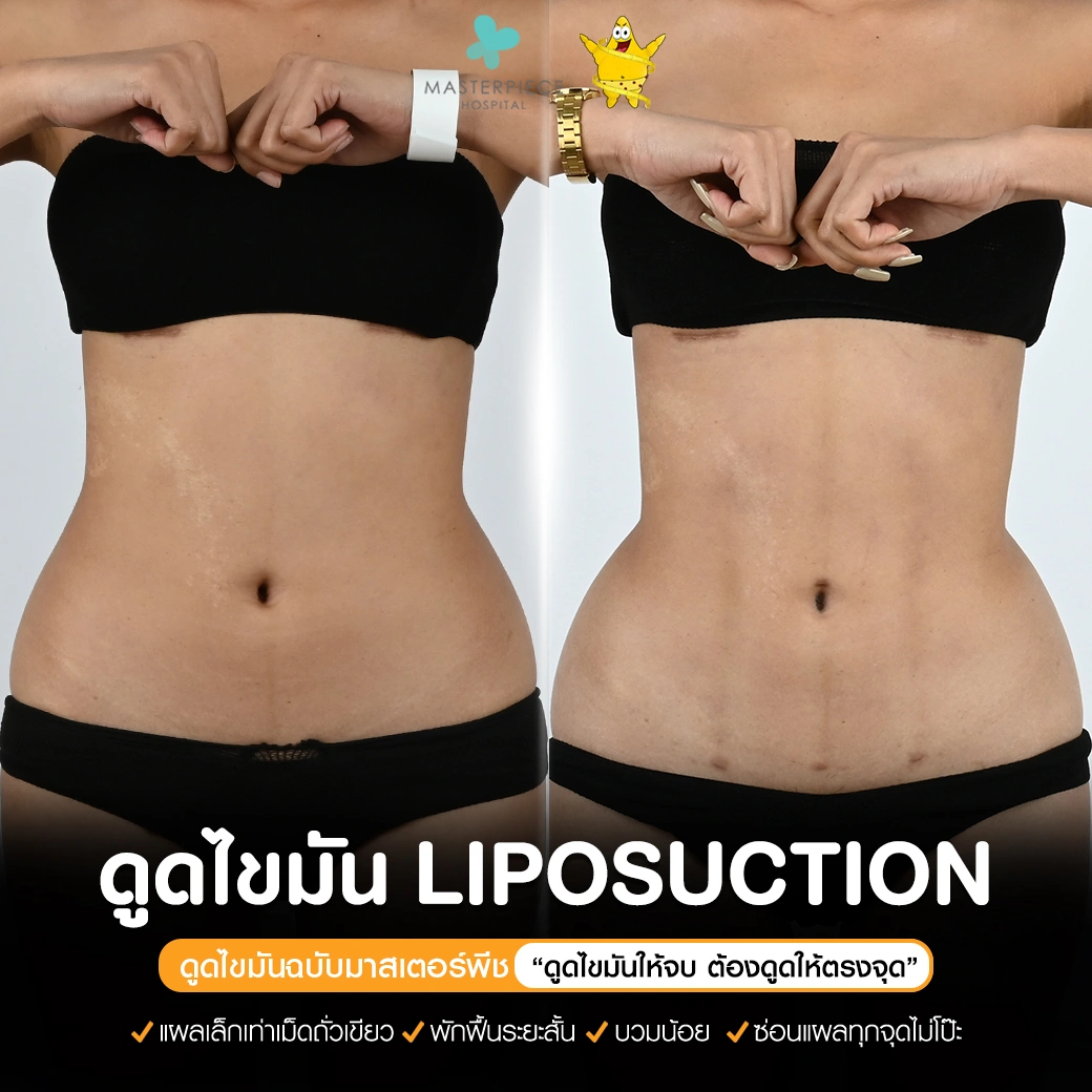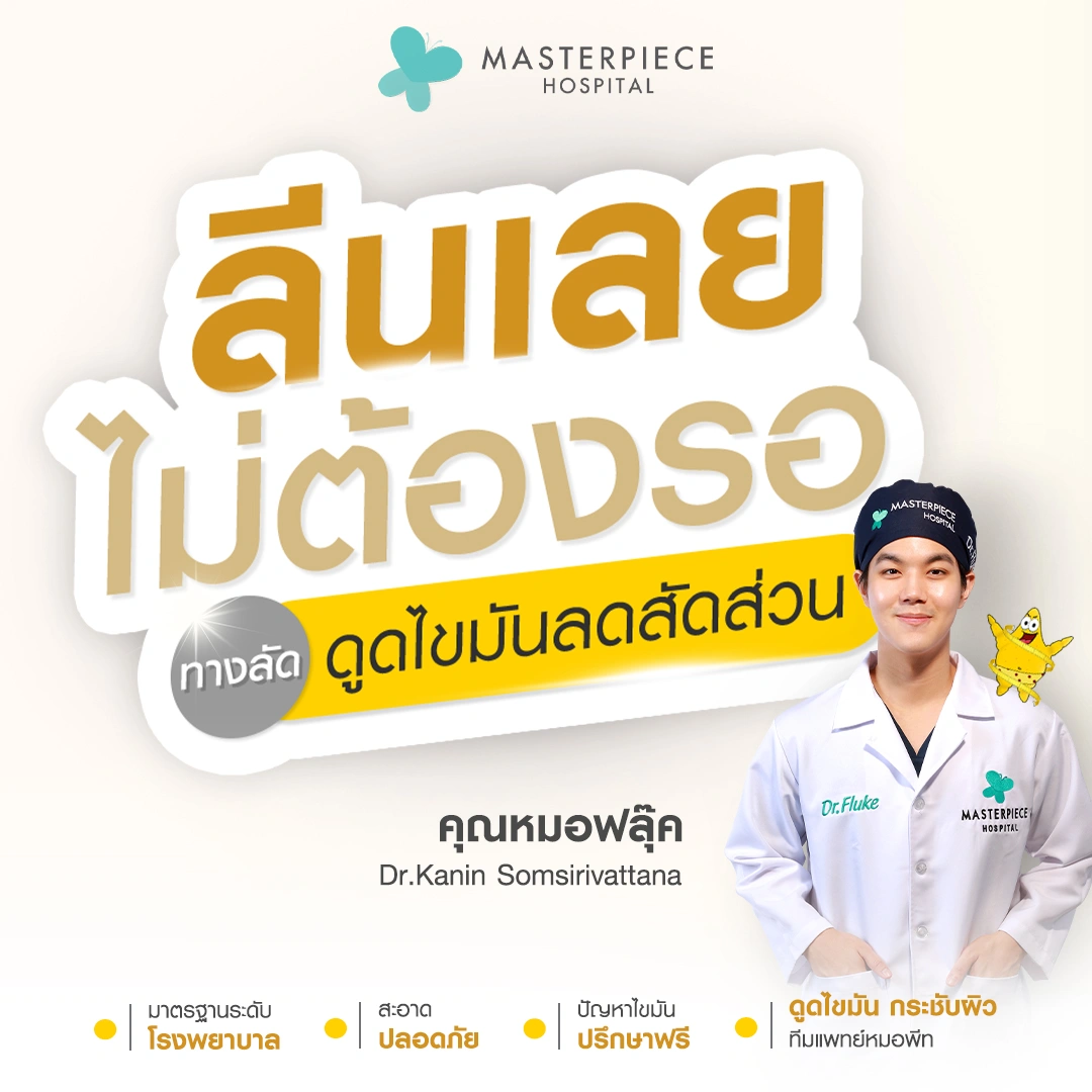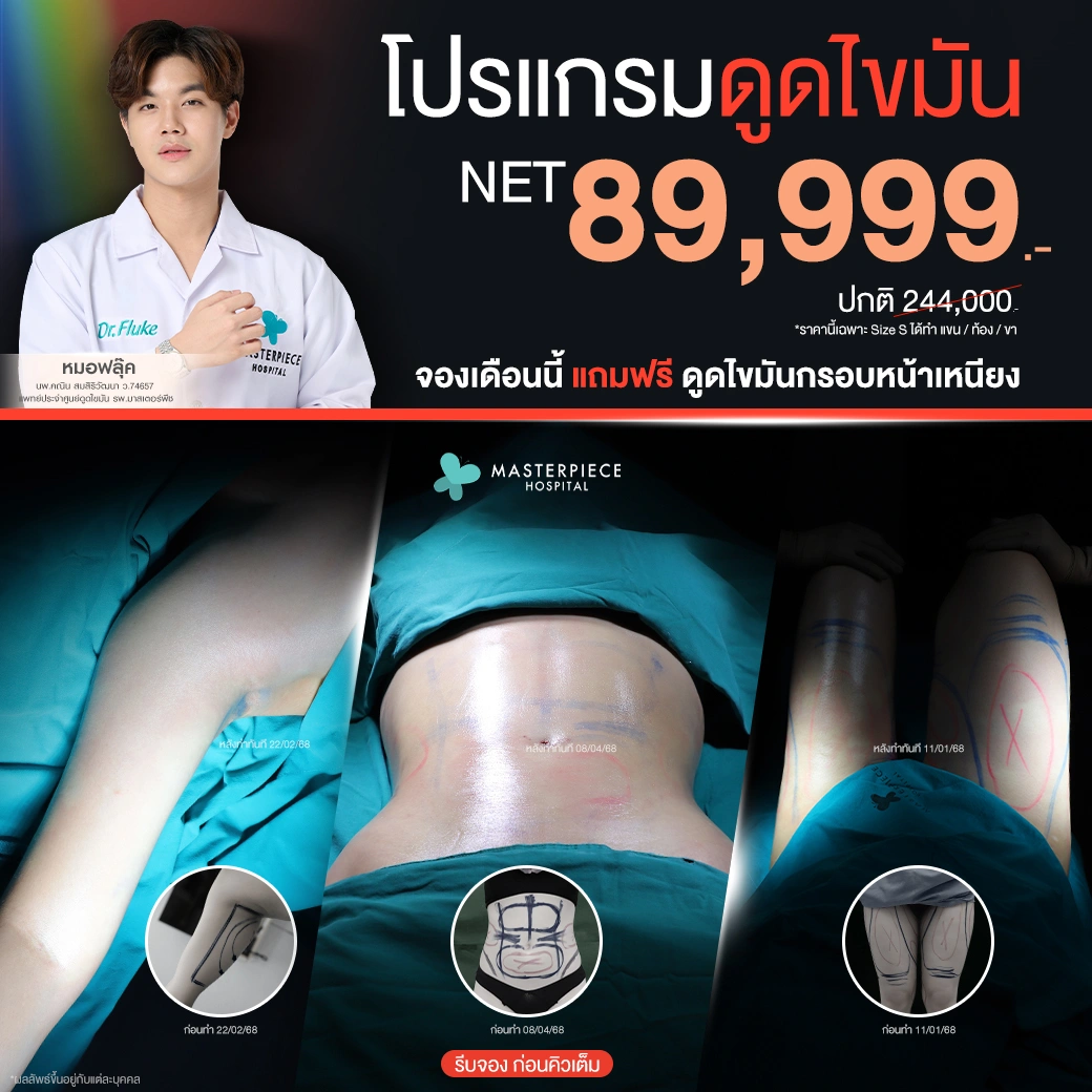 ปรึกษาและดูดไขมันที่โรงพยาบาลมาสเตอร์พีช เพื่อรูปร่างกระชับ สวยงาม ด้วยเทคโนโลยีทันสมัยและทีมแพทย์เฉพาะทางด้านการดูดไขมัน พร้อมให้คำแนะนำและดูแลทุกขั้นตอน จองคิวปรึกษาฟรีวันนี้ ! โทร 02-105-4370 หรือเยี่ยมชมเว็บไซต์ของเราเพื่อดูข้อมูลเพิ่มเติมที่ www.masterpiecehospital.com