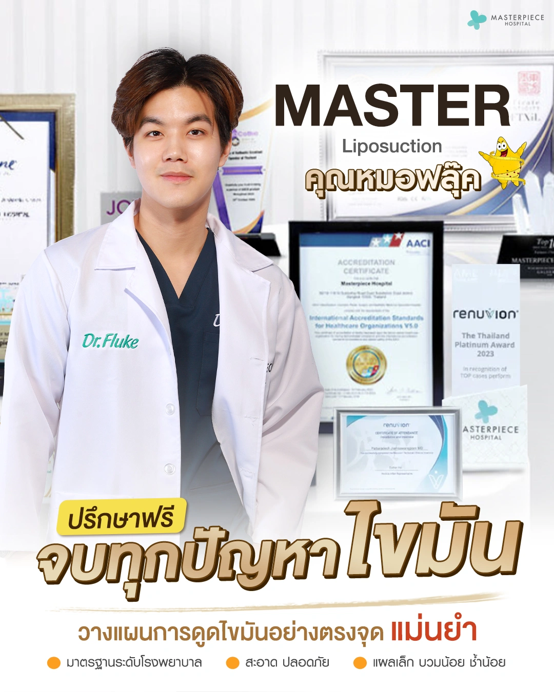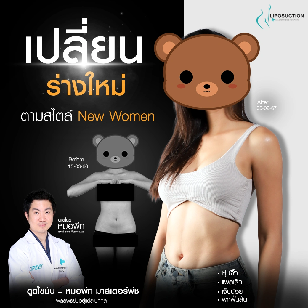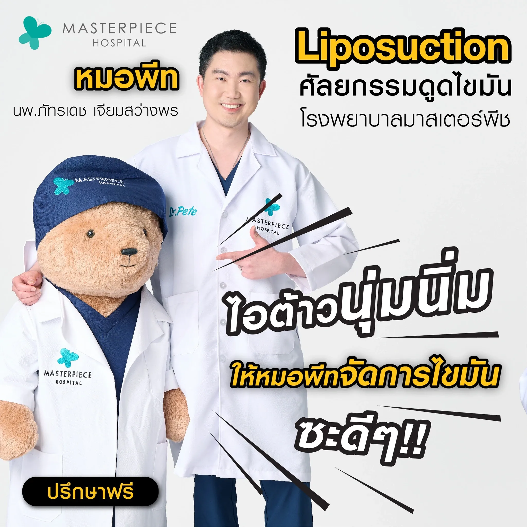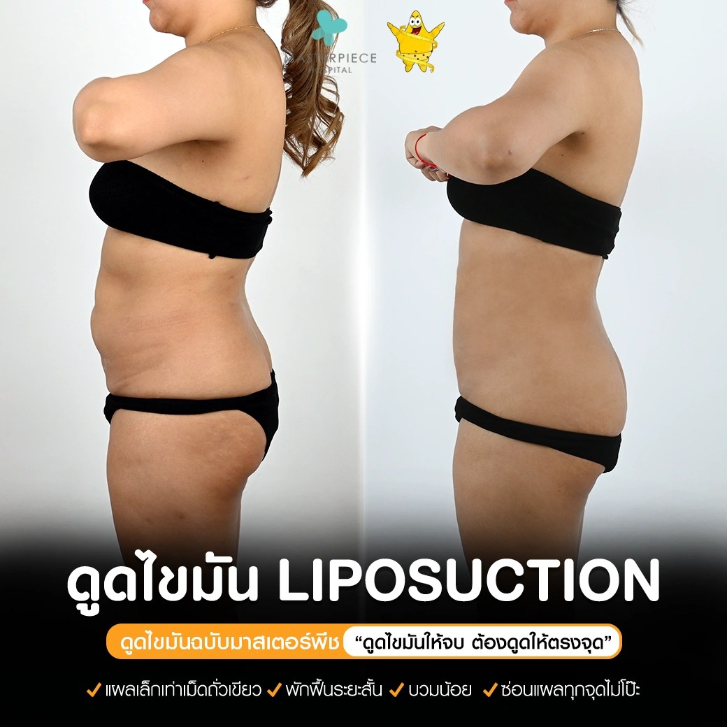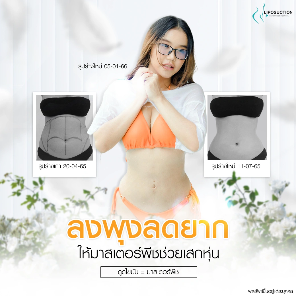 ปรึกษาและดูดไขมันที่โรงพยาบาลมาสเตอร์พีช เพื่อรูปร่างกระชับ สวยงาม ด้วยเทคโนโลยีทันสมัยและทีมแพทย์เฉพาะทางด้านการดูดไขมัน พร้อมให้คำแนะนำและดูแลทุกขั้นตอน จองคิวปรึกษาฟรีวันนี้ ! โทร 02-105-4370 หรือเยี่ยมชมเว็บไซต์ของเราเพื่อดูข้อมูลเพิ่มเติมที่ www.masterpiecehospital.com