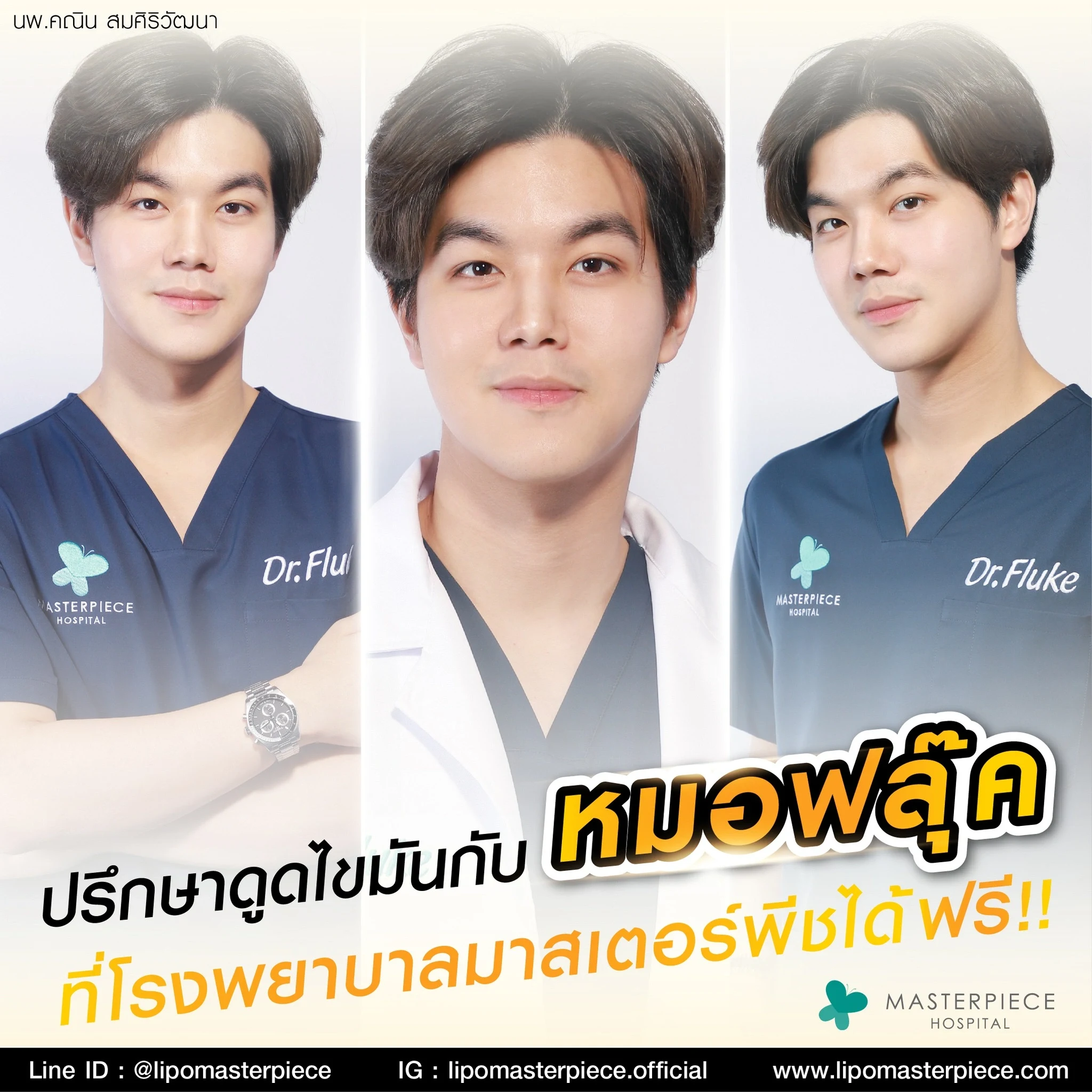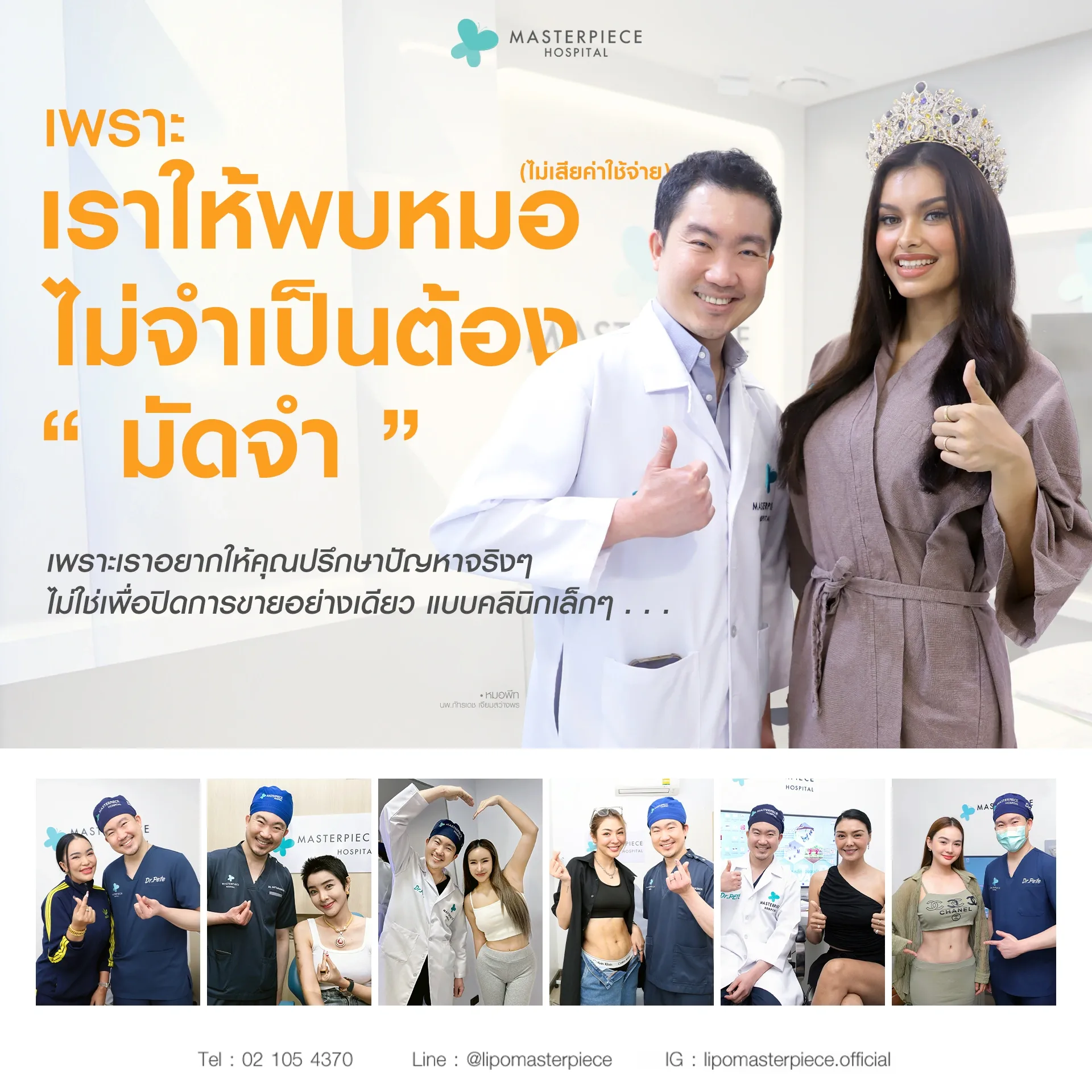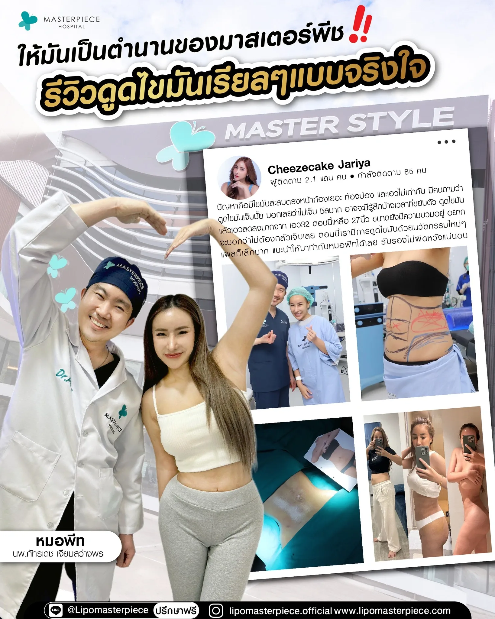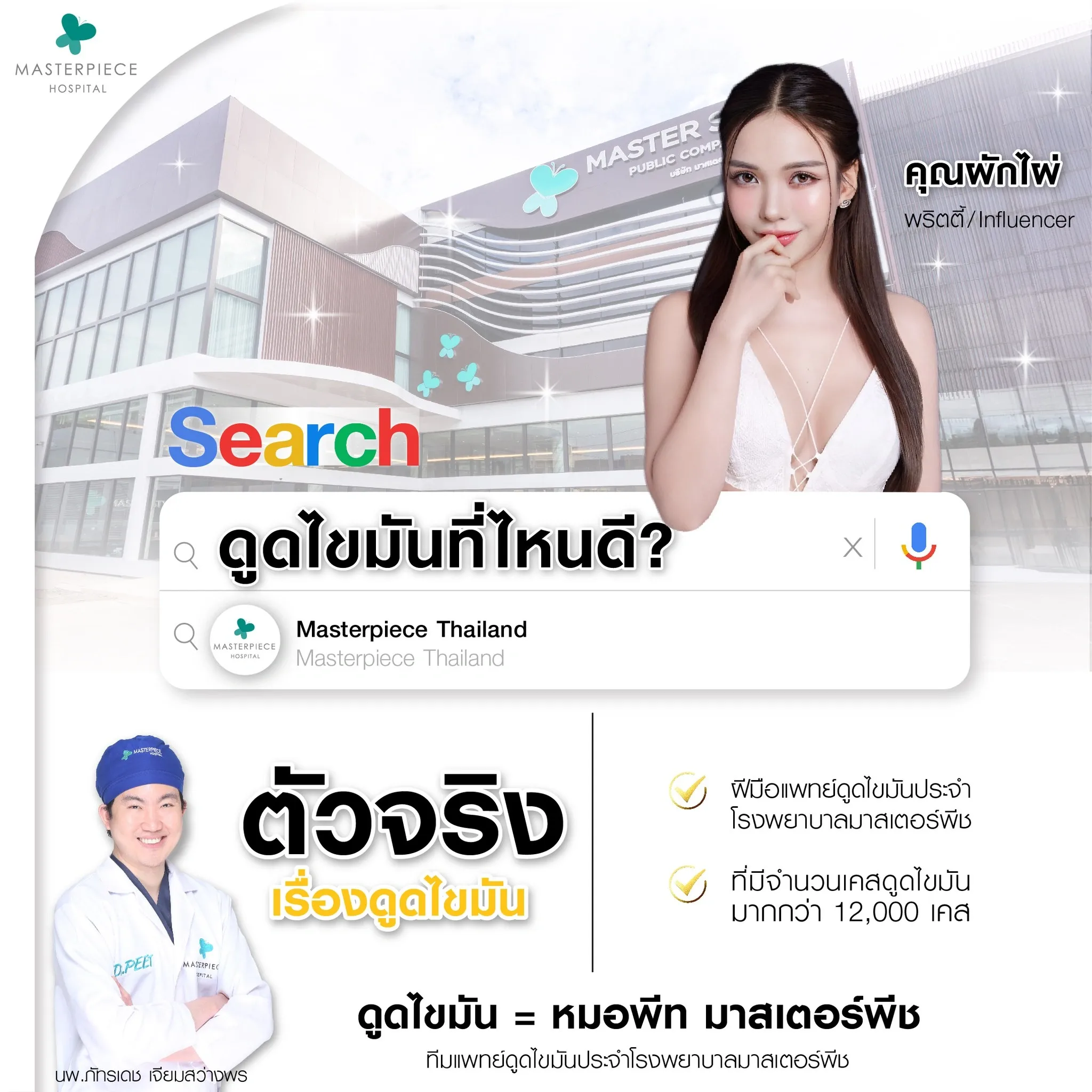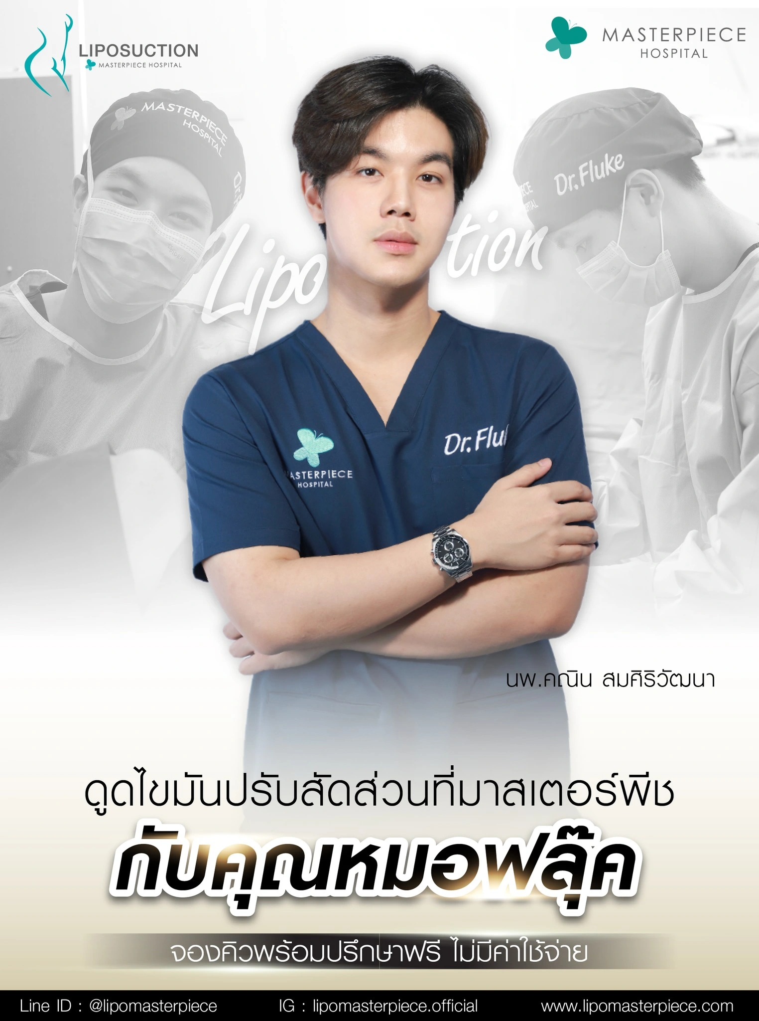 ปรึกษาและดูดไขมันที่โรงพยาบาลมาสเตอร์พีช เพื่อรูปร่างกระชับ สวยงาม ด้วยเทคโนโลยีทันสมัยและทีมแพทย์เฉพาะทางด้านการดูดไขมัน พร้อมให้คำแนะนำและดูแลทุกขั้นตอน จองคิวปรึกษาฟรีวันนี้ ! โทร 02-105-4370 หรือเยี่ยมชมเว็บไซต์ของเราเพื่อดูข้อมูลเพิ่มเติมที่ www.masterpiecehospital.com