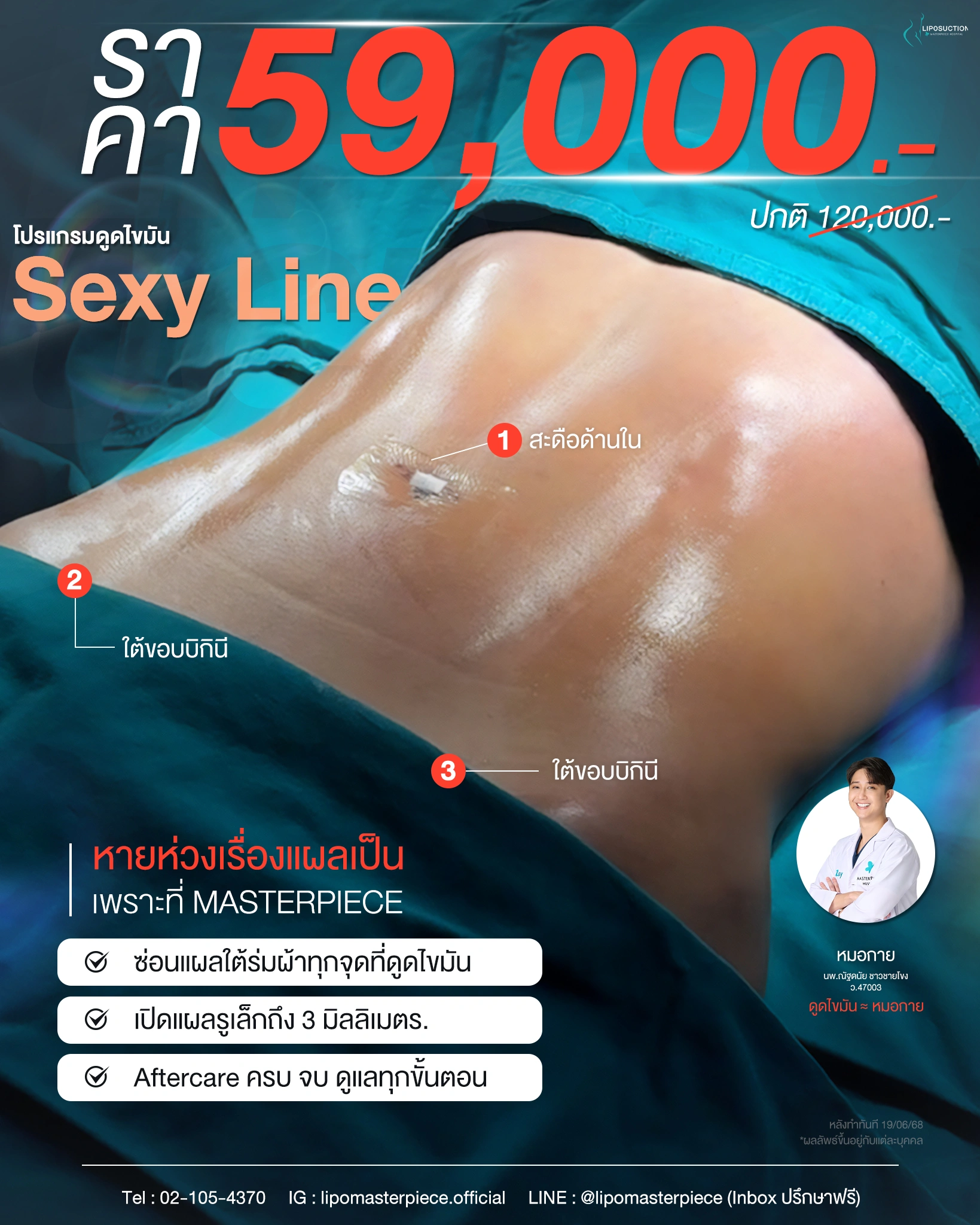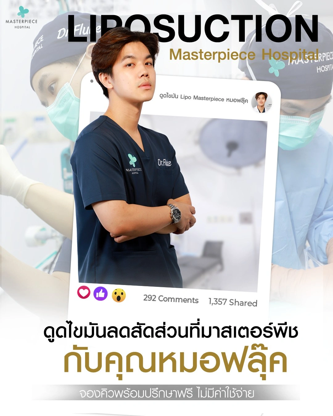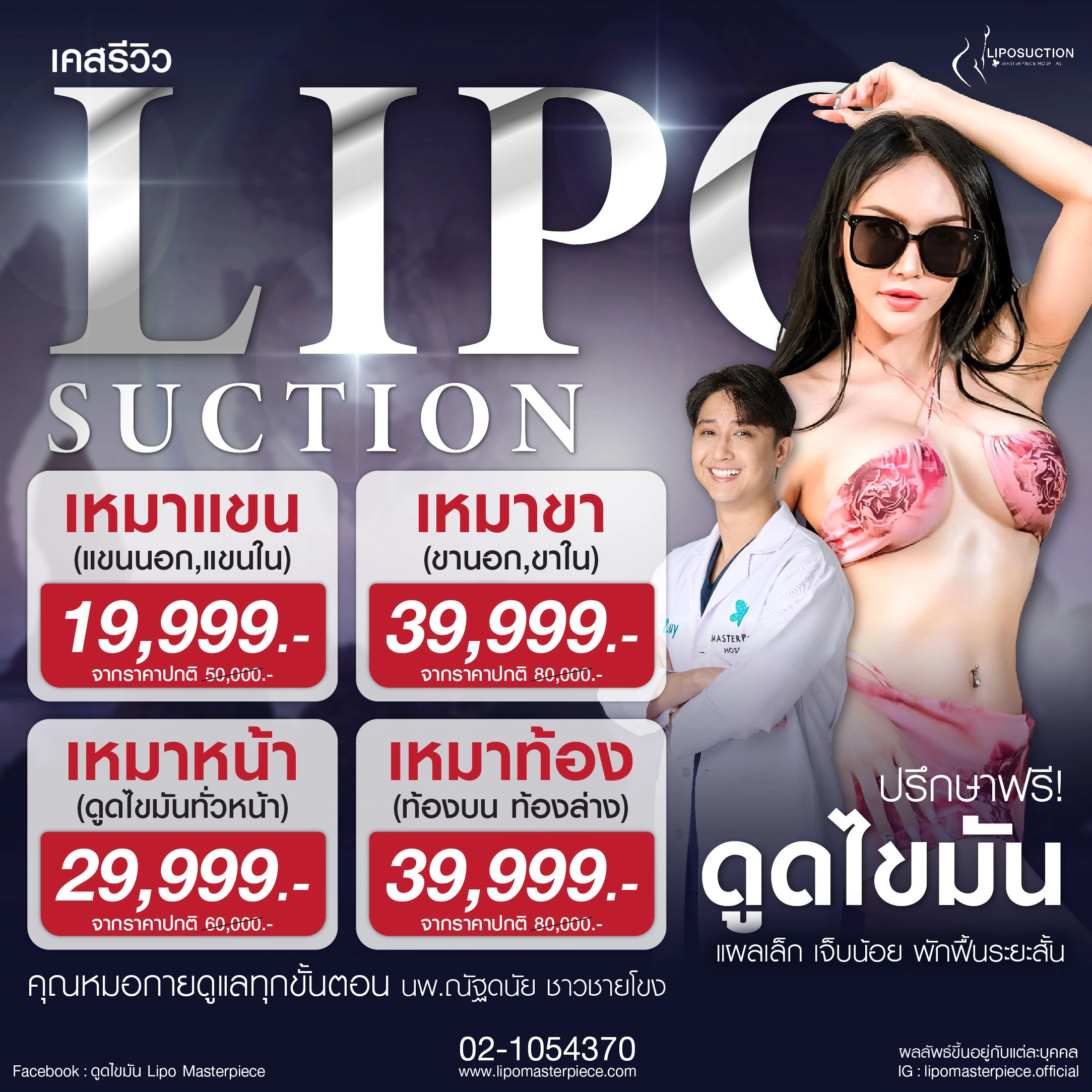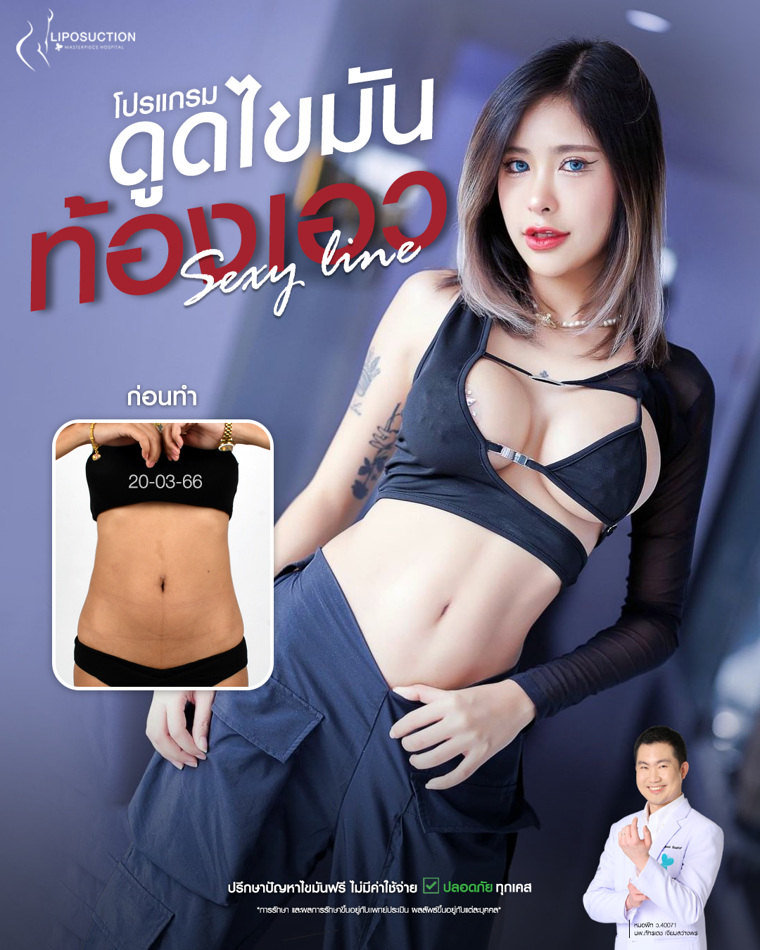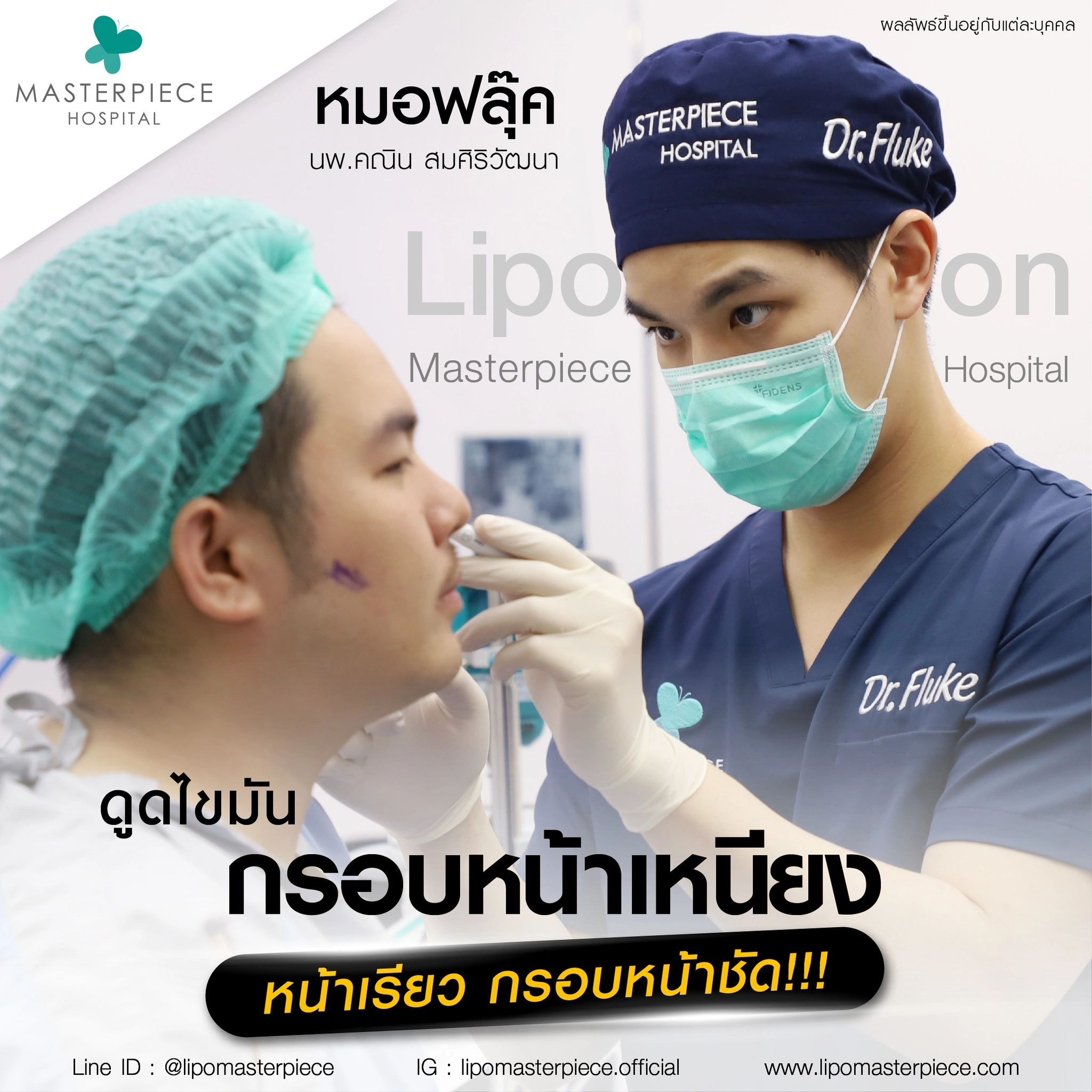 ปรึกษาและดูดไขมันที่โรงพยาบาลมาสเตอร์พีช เพื่อรูปร่างกระชับ สวยงาม ด้วยเทคโนโลยีทันสมัยและทีมแพทย์เฉพาะทางด้านการดูดไขมัน พร้อมให้คำแนะนำและดูแลทุกขั้นตอน จองคิวปรึกษาฟรีวันนี้ ! โทร 02-105-4370 หรือเยี่ยมชมเว็บไซต์ของเราเพื่อดูข้อมูลเพิ่มเติมที่ www.masterpiecehospital.com