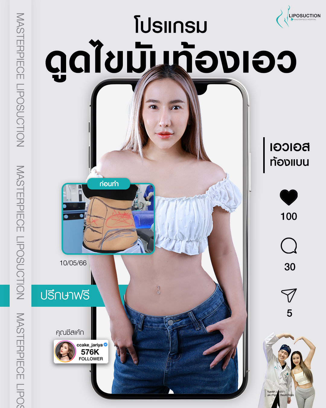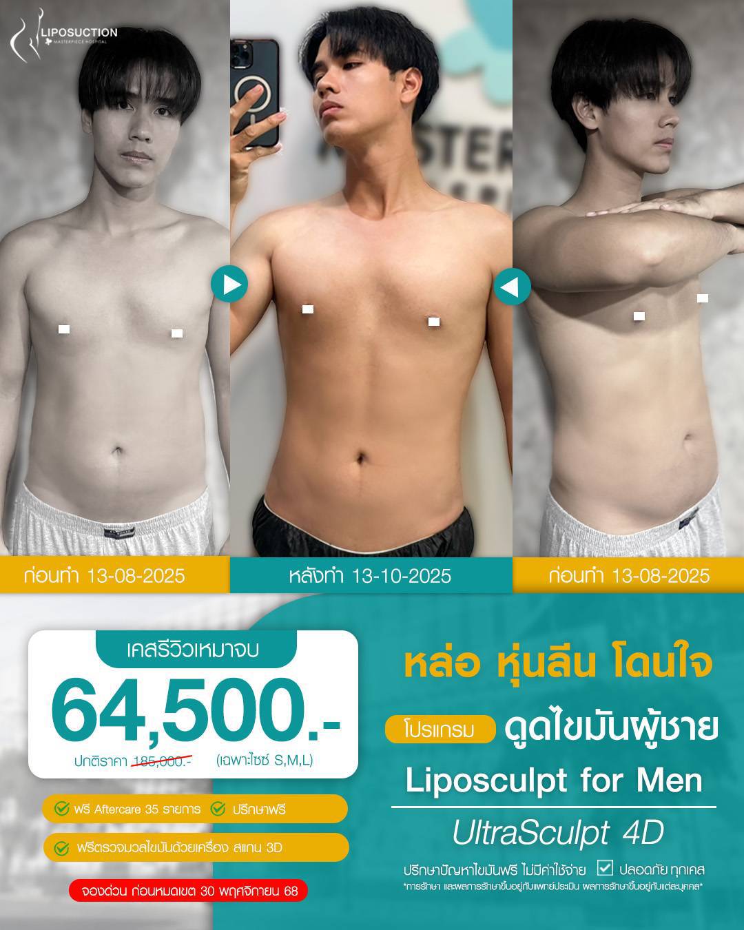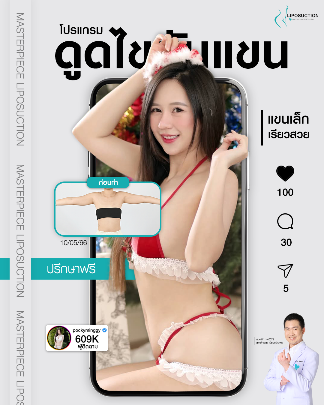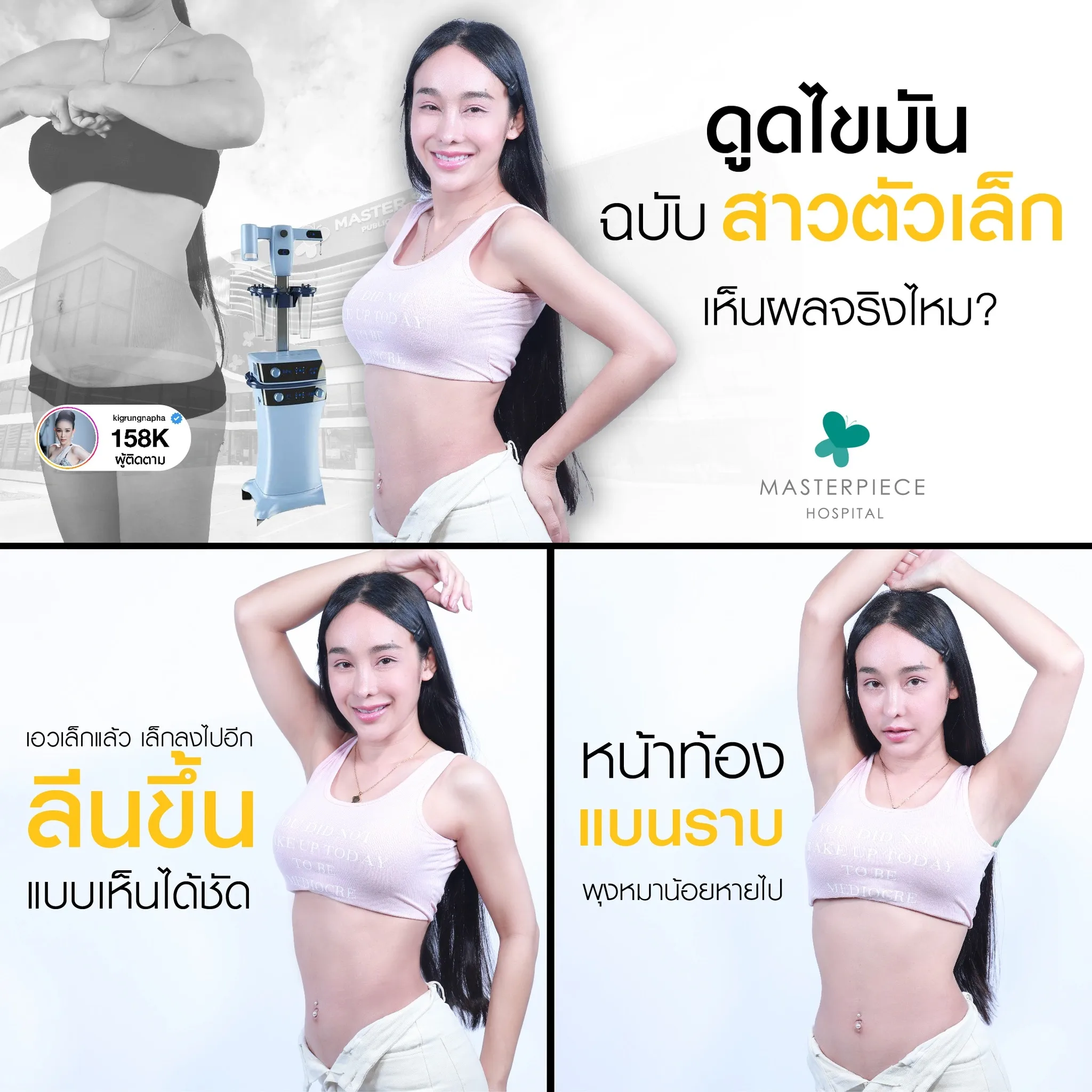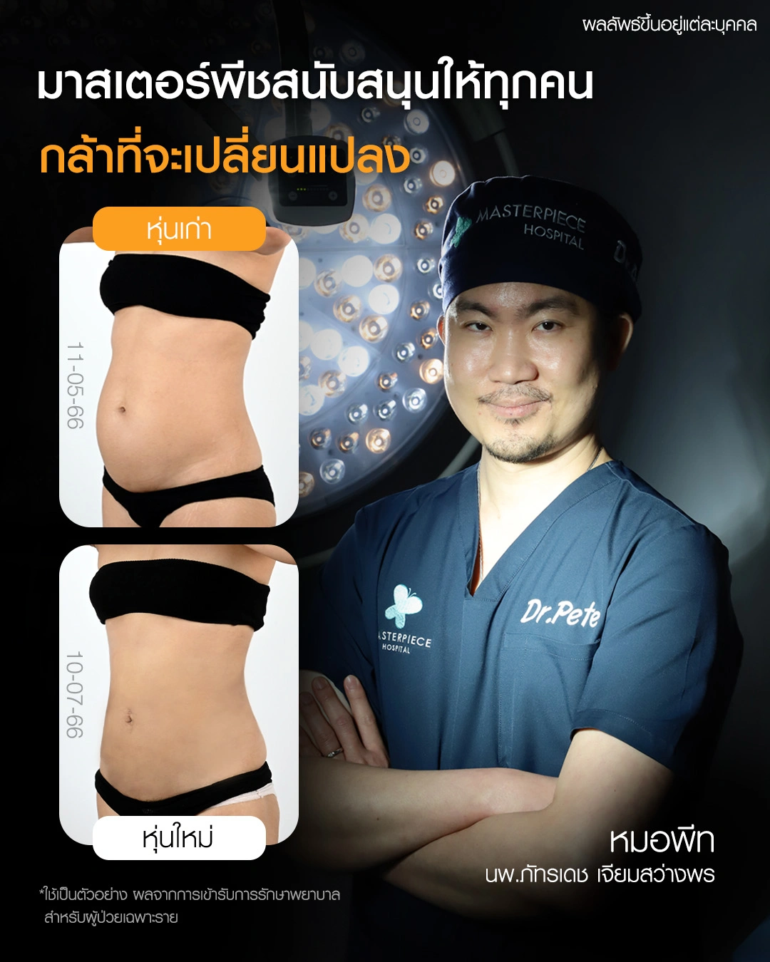 ปรึกษาและดูดไขมันที่โรงพยาบาลมาสเตอร์พีช เพื่อรูปร่างกระชับ สวยงาม ด้วยเทคโนโลยีทันสมัยและทีมแพทย์เฉพาะทางด้านการดูดไขมัน พร้อมให้คำแนะนำและดูแลทุกขั้นตอน จองคิวปรึกษาฟรีวันนี้ ! โทร 02-105-4370 หรือเยี่ยมชมเว็บไซต์ของเราเพื่อดูข้อมูลเพิ่มเติมที่ www.masterpiecehospital.com